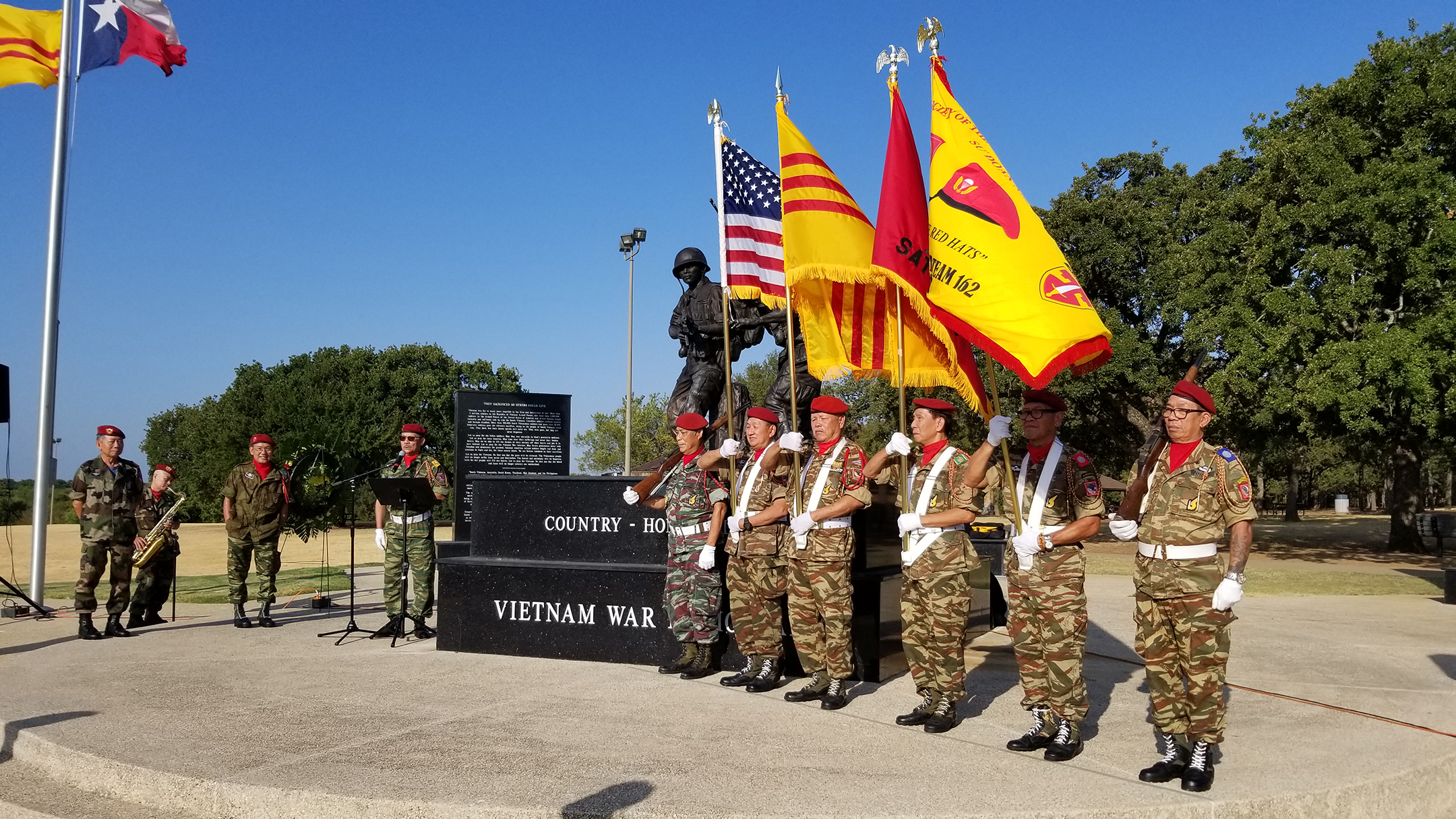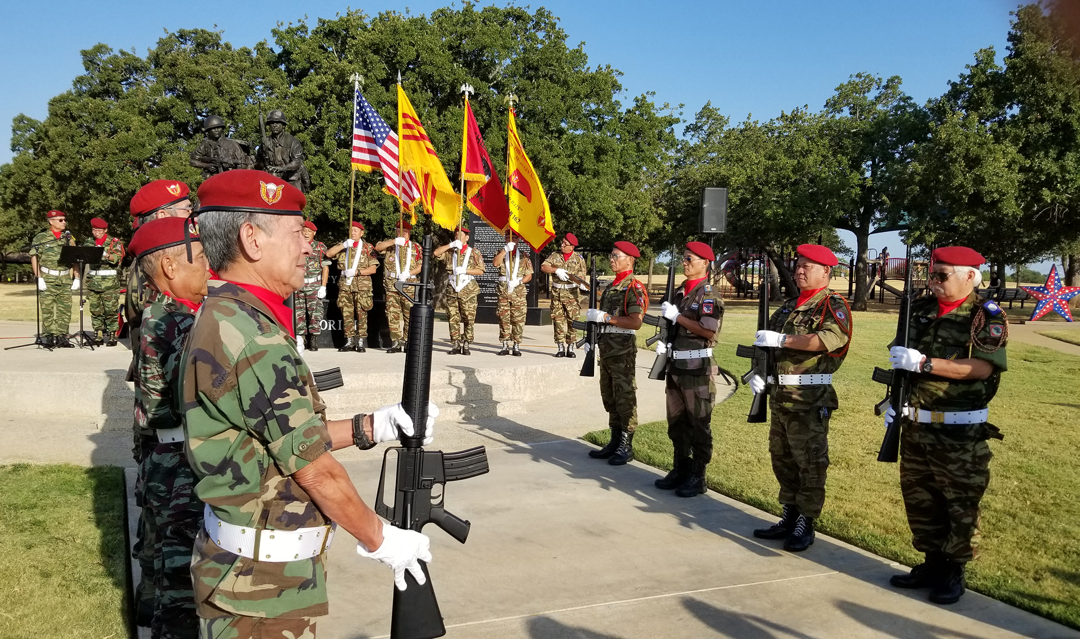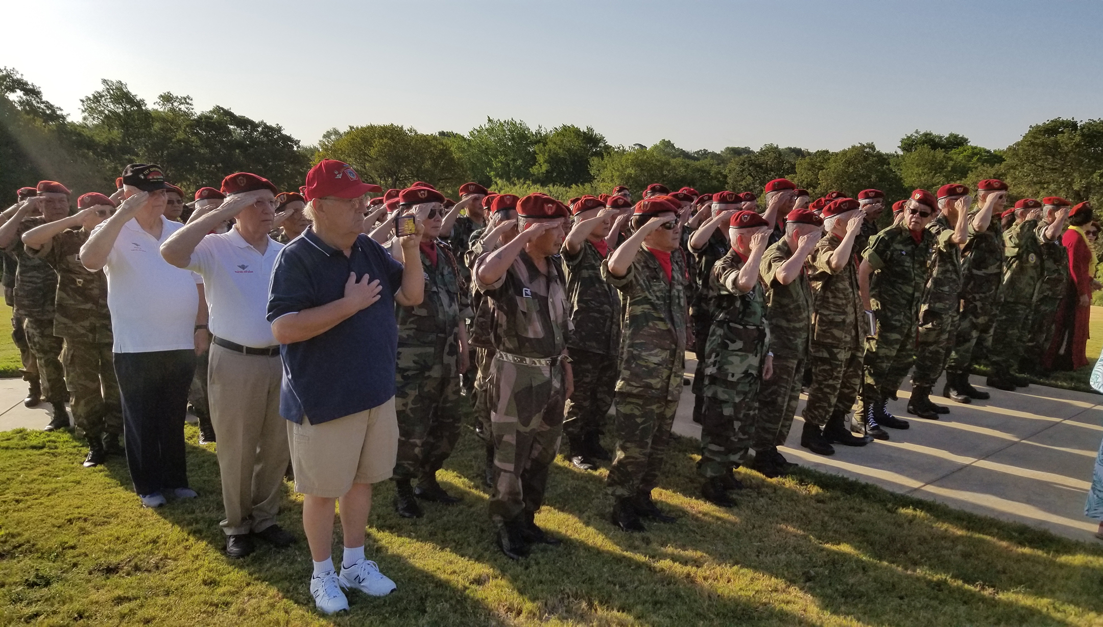Sáng Thứ Bảy chào quốc kỳ và đặt vòng hoa tại Tượng Đài Chiến Sĩ Việt Mỹ DFW cũng tại thành phố Arlington, lần đầu tiên tại nơi đây, một rừng mũ đỏ áo hoa và đội bồng súng chào xuất hiện trong buổi lễ chào quốc kỳ của một binh chủng tổng trừ bị, nhìn vào thôi cũng nhận ra khí thế hừng hực ngày nào trên quê hương của đoàn quân Mũ Đỏ, mà ngày nay mặc dù tuổi đời chồng chất vẫn không xóa nhòa được hình ảnh hiên ngang của người lính Nhảy Dù cùng các đơn vị bạn xung phong trên tuyến đầu bảo vệ tổ quốc. Sau đó, Mũ Đỏ Nguyễn Đình Trung cũng là Phó Chủ tịch Ngoại Vụ GĐMĐ Dallas-Fort Worth lên chào mừng mọi người tham dự, cám ơn GĐMĐVN đã phối hợp trong buổi lễ chào quốc kỳ tại đây.