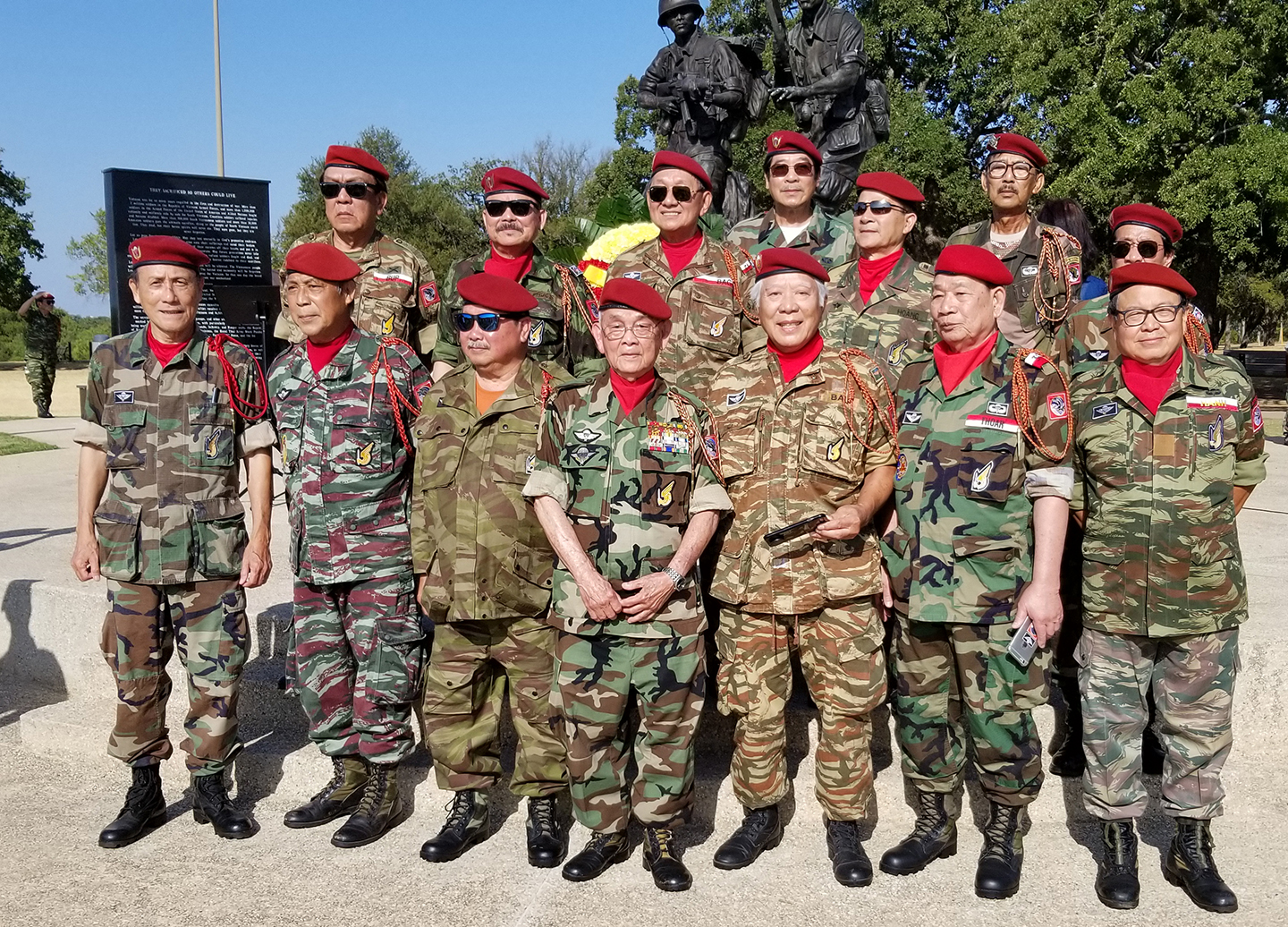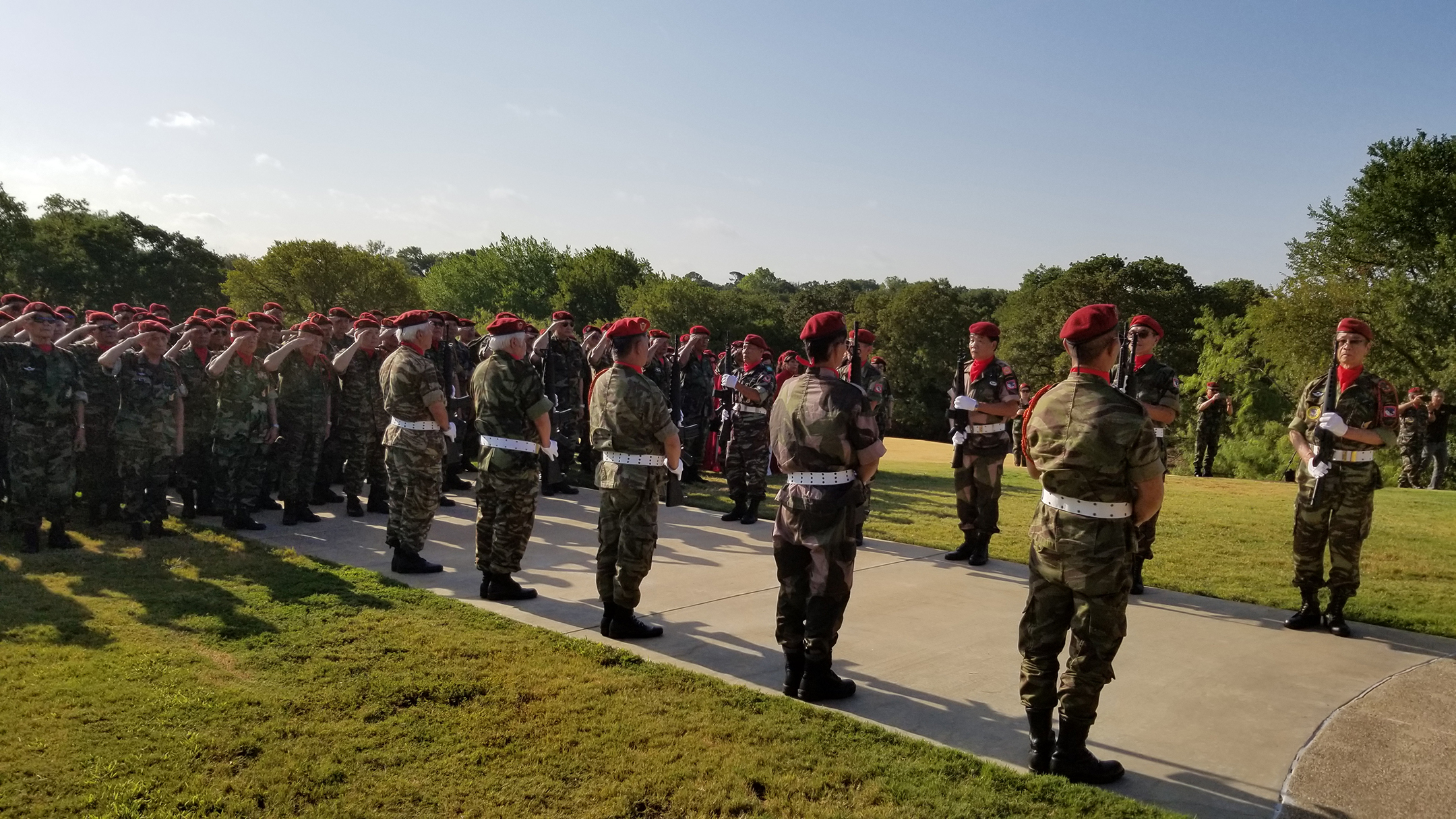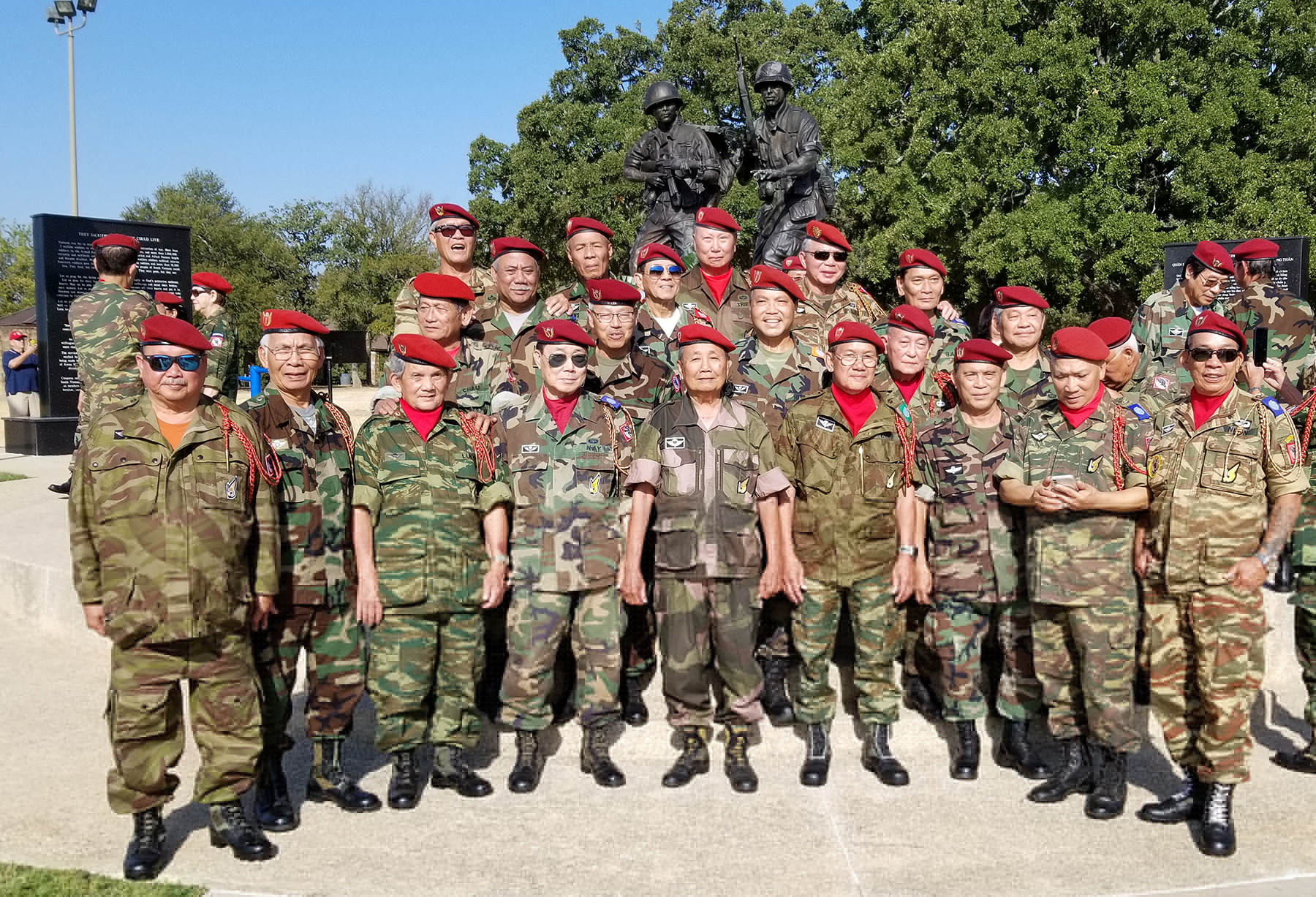 Sáng Thứ Bảy chào quốc kỳ và đặt vòng hoa tại Tượng Đài Chiến Sĩ Việt Mỹ DFW cũng tại thành phố Arlington, lần đầu tiên tại nơi đây, một rừng mũ đỏ áo hoa và đội bồng súng chào xuất hiện trong buổi lễ chào quốc kỳ của một binh chủng tổng trừ bị, nhìn vào thôi cũng nhận ra khí thế hừng hực ngày nào trên quê hương của đoàn quân Mũ Đỏ, mà ngày nay mặc dù tuổi đời chồng chất vẫn không xóa nhòa được hình ảnh hiên ngang của người lính Nhảy Dù cùng các đơn vị bạn xung phong trên tuyến đầu bảo vệ tổ quốc. Sau đó, Mũ Đỏ Nguyễn Đình Trung cũng là Phó Chủ tịch Ngoại Vụ GĐMĐ Dallas-Fort Worth lên chào mừng mọi người tham dự, cám ơn GĐMĐVN đã phối hợp trong buổi lễ chào quốc kỳ tại đây.